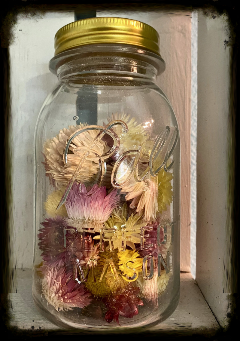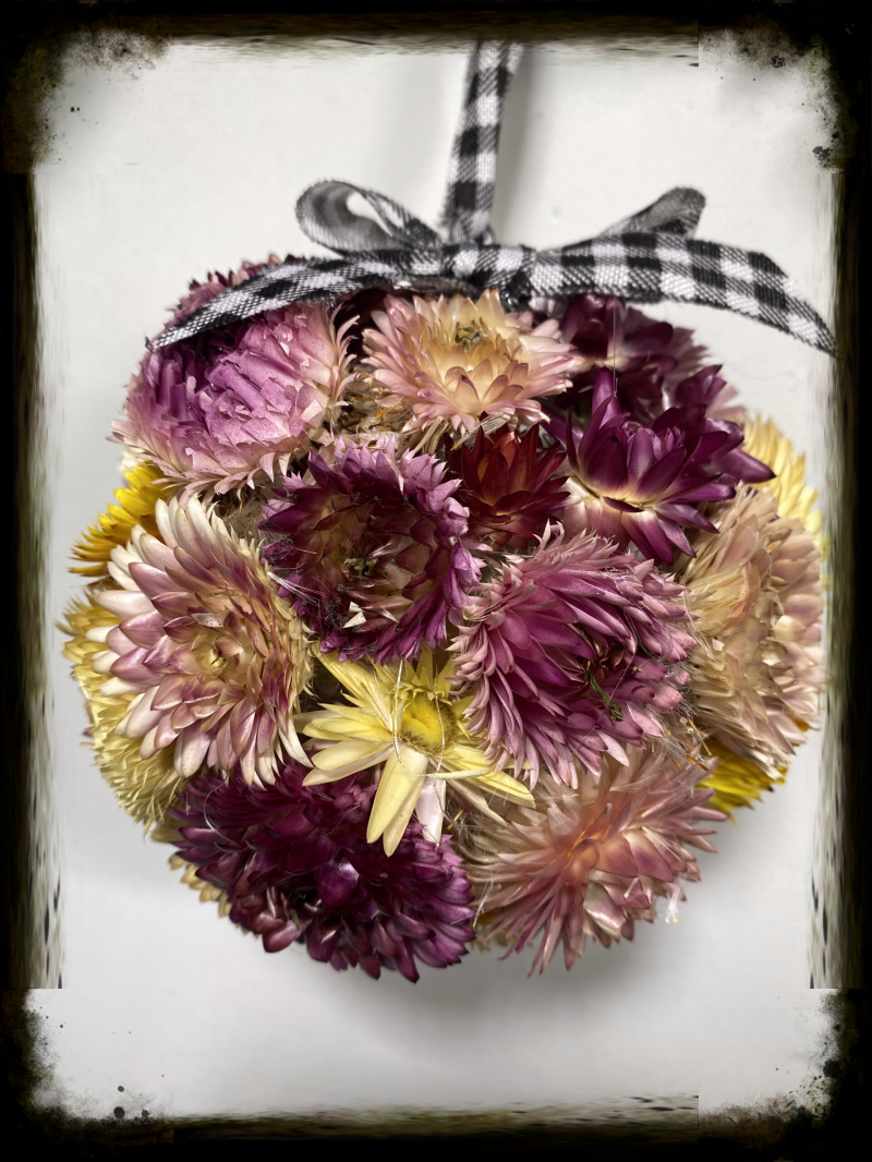 These are one of the most unique flowers that I have grown, they are absolutely beautiful and so fun, they have a papery feel, they call them the forever flower and are great for making dried flower arrangements, florists love them because they add color to cut flower arrangements all through the year. I love to dry them and store them in an old mason jar and just set it in a shelf, mine in this picture is a Perfect Mason, it has bubbles in the glass, I don’t know how old it, but it has a chip in the top so I use it for decoration. As far as medicinal properties you can make an oil infusion to help with aging skin, I will be making a blog post on that in the future. For this showcase I am going to make a primitive flower ball for hanging in a quaint little spot or for a sweet gift for someone special
