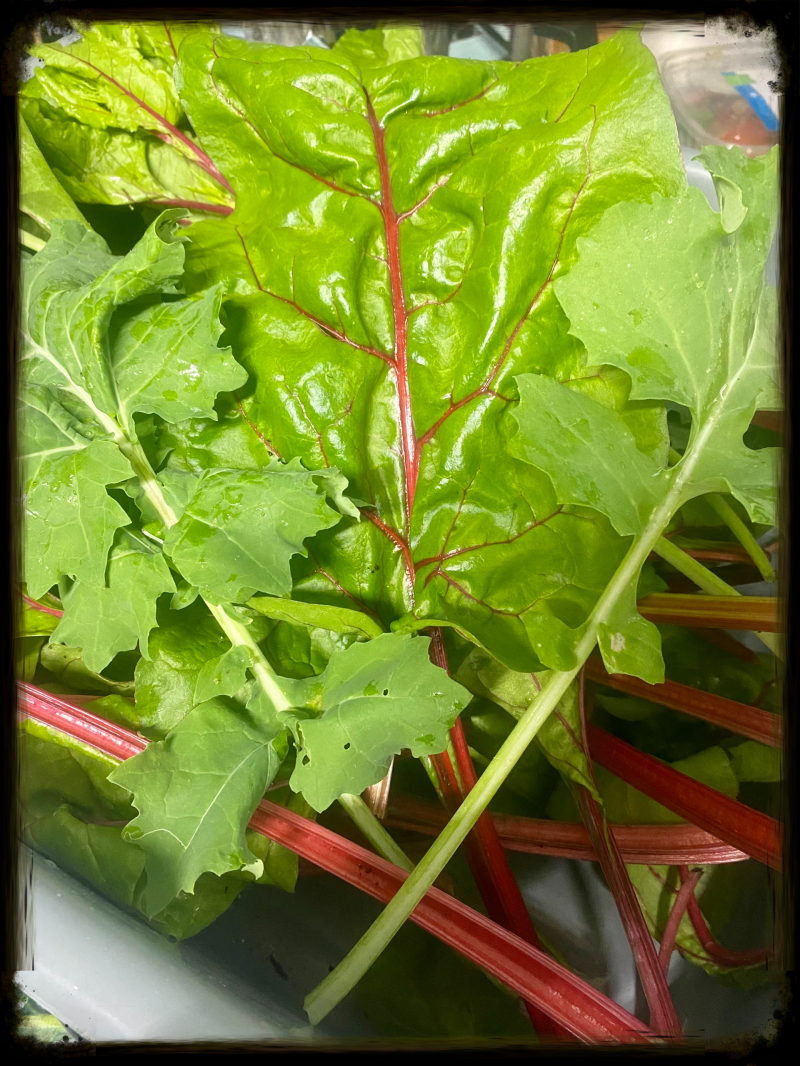 Any leafy greens will work for this recipe, I just used what I had ample of in my garden, I have really been enjoying the Brussel sprout, turnip and broccoli greens lately.